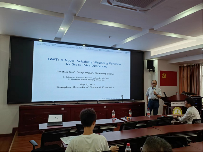 2023年5月9日14:30,由金融学院主办的国家金融学高端学术论坛系列讲座第11期学术报告成功举办。报告主题为GWT: A Novel Probability Weighting Function for Stock Price Distortions。本次讲座由中国人民大学张顺明教授主讲,金融学院黄金波教授主持,学院30余位师生代表参加了此次讲座。张教授首先介绍了期望效用理论与非期望效用理论在依据概率分布进行决策时的区别,阐述了期望效用理论往往无法精准刻画投资者的风险偏好状态,需要非期望效用理论进行完善的研究动机。然后,张顺明教授提出了一种新的概率加权函数,即广义王变换(GWT)。该函数具有独特的正态不变性,且在不同参数范围内表现出不同特征的形状分布,便于刻画投资者的风险偏好状态。同时张教授也给出了该函数成立所需的假设条件,基于此证明了风险厌恶和损失厌恶条件下的资本资产定价模型和证券市场线定理。最后,张教授通过数值模型说明了所提出的概率加权函数可以对资产的偏度进行定价,并发现了偏度的过度定价现象。讲座最后,参会老师及同学就广义王变换(GWT)及其在行为金融、资产定价中的应用,积极与张教授进行讨论,学习到了相关研究领域的选题热点,极大开阔了大家的科研视野。
