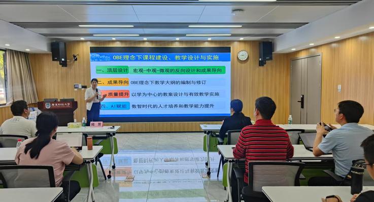 广东省本科高校在线开放课程指导委员会委员、广东省高等教育学会教育技术专业委员会副秘书长、华南理工大学混合式课程建设专家陆芳教授就“OBE理念下课程建设、教学设计与实施”进行了专题辅导。她围绕OBE理念下如何进行教学设计和教学大纲编制、AI时代如何提升教师教学能力和人才培养质量等方面为教师们提供了新的教学思路和方法。她指出,学校需要按照系统化、体系化、规范化的方向设计人才培养方案,以学校人才培养总体目标为指引,从校训出发,在各学院、各专业层面进行层层落实与细化。她还借助多个案例,详细阐述了如何将教育教学OBE理念全面融入教育教学的各个环节,为教师们提供了具体示范与实践指导。