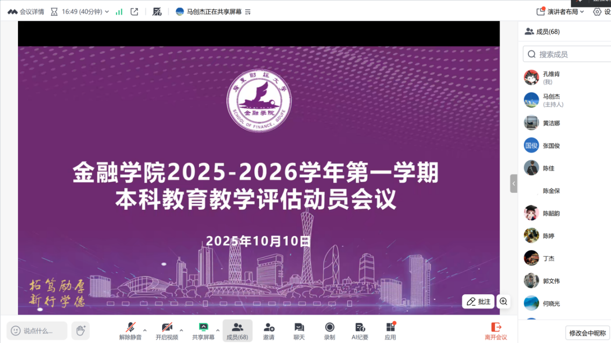10月10日晚,学院召开全体教师线上会议,传达学校学校本科教育教学审核评估迎评工作动员大会精神,强调线上教学和线下教学都是检查重点,要严格落实教学常规检查,再次检查教学大纲、教学执行计划和进度表,加强课堂巡查,务必保证教学质量过硬。强调学院全体师生要严格按照学校统一部署,积极配合协调,以最佳状态迎接正式评估。