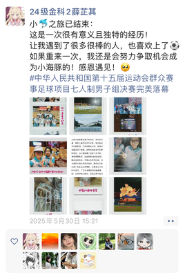 作为十五届全运会开幕式的一枚小海豚,我的志愿初心朴实而真切。它始于一种“被需要”的温暖,源于渴望用我的真诚服务为四年一届的体育盛会贡献自己的绵薄之力。这份初心驱动着我报名第十五届全运会志愿者的选拔。