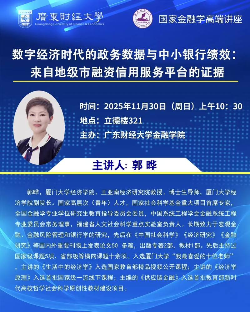 【国家金融学高端讲座预告】数字经济时代的政务数据与中小银行绩效:来自地级市融资信用服务平台的证据