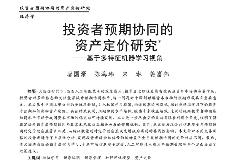 大数据时代下,随着人工智能技术的深度应用,投资者比以往更能有效关注资本市场的海量信息。投资者对多维信息的关注能否提升预期协同水平,这一问题对于深刻理解资本市场的预期形成具有重要意义。本文基于中国上市公司的多维度特征,引入机器学习框架,构造预期协同指标,探讨多特征学习下的投资者预期如何影响资产定价。实证结果表明,预期协同水平越低,股票未来收益越低,这说明提高投资者的预期协同水平有助于我国资本市场的稳定与可持续发展。本文进一步从卖空约束与有限套利两个角度,证明了错误定价是投资者预期协同与股票未来收益正相关关系的作用机制。此外,本文还发现会计信息质量与预期协同的定价效应显著负相关,而特征数量则对定价效应呈现先增强后减弱的非线性影响。本文针对不同交易风格的投资者进行了异质性分析,发现投资者对金融信号的偏好差异会导致预期协同的定价效应不同。最后,本文围绕我国的投资者信息学习、资本市场信息质量建设、人工智能技术应用与预期管理等多个方面提出了政策建议。