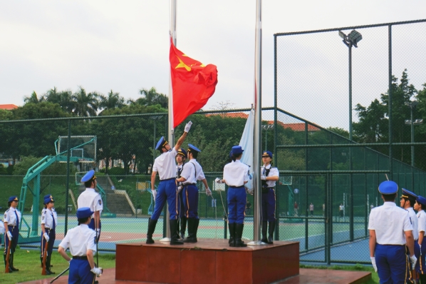 在全体师生的注目礼下,国旗护卫队迈着铿锵有力的步伐,护卫五星红旗走向升旗台。伴随着雄壮激昂的《义勇军进行曲》,鲜艳的五星红旗冉冉升起、迎风飘扬。全体师生肃立注目、高唱国歌,爱国情怀在心中激荡,庄严的仪式感浸润人心。