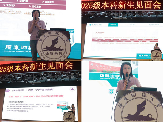 9月9日,学院党委书记黄洁娜作了题为“校史校情与精神传承”的专题讲座。她以时间为轴,娓娓道来广东财经大学四十余载的峥嵘岁月。讲座中,黄书记以富有感染力的语言,深入诠释“厚德、励学、笃行、拓新”校训的深厚意蕴,解读“正心诚意,求真向善”的广财精神与“榴园精神”的深刻内涵,引领新生感受学校历久弥新的文化根基。她还特别介绍了金融学院的雄厚的教学科研实力,为同学们的学术生涯铺就坚实道路。这场讲座如春风化雨,不仅让新生深刻体会到身为“广财人”的归属感和自豪感,更在他们心中种下了赓续传统、追求卓越的种子,为今后的学业生涯注入了深沉而持久的精神动力。