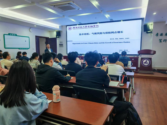 首先,郭文伟教授阐述了“危中有机:气候风险与保险网点增长”选题的国际国内政策背景和现实背景,阐述了“气候风险—保险需求”的理论框架,强调利用保险机制分散和转移灾害损失已成为国际社会应对气候变化风险的重要手段,为深入剖析气候风险的经济学意义,参考了权威文献并对气候风险和保险网点增长进行了机制的分析,通过异质性检验揭示了气候风险的上升能够有效促进财产保险公司和人寿保险公司增设网点,但是,其对寿险公司网点增长的促进作用较小。经过严谨的实证分析最后得出气候风险的上升会通过提升社会环境关注度、保险需求和加大保险供给显著促进保险网点的增长等结论。