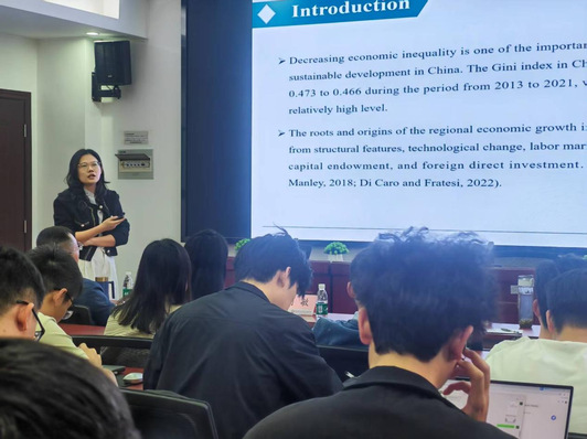 最后,廖丽萍教授作题为“Green place-based policy and growth inequality: Quasi-natural experimental evidence from China”(绿色区位导向政策与增长不平等:来自中国的准自然实验证据)的分享。国家生态工业示范园区政策作为一种兼具区位导向和环境规制双重属性的绿色政策,为研究城市间增长不平等提供了独特视角。该研究突破传统分析框架,系统考察了这类绿色区位政策对区域经济发展差距的影响。研究发现,国家生态工业示范园区政策在促进经济发展的同时,确实会扩大城市间经济增长的不平等。具体而言,该政策对生态工业基础较好、初始经济水平较高的优势城市具有更明显的经济增长促进效应。这一影响的内在机制在于:政策主要通过促进企业绿色创新和推动产业结构升级两个渠道发挥作用,而这些效应在优势城市中表现得更为显著。