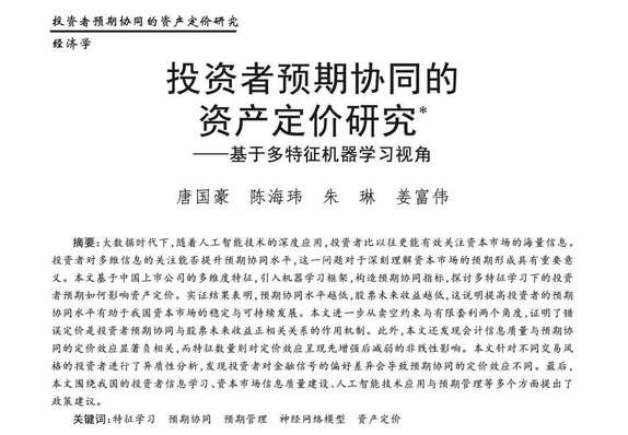 大数据时代下,随着人工智能技术的深度应用,投资者比以往更能有效关注资本市场的海量信息。投资者对多维信息的关注能否提升预期协同水平,这一问题对于深刻理解资本市场的预期形成具有重要意义。本文基于中国上市公司的多维度特征,引入机器学习框架,构造预期协同指标,探讨多特征学习下的投资者预期如何影响资产定价。实证结果表明,预期协同水平越低,股票未来收益越低,这说明提高投资者的预期协同水平有助于我国资本市场的稳定与可持续发展。本文进一步从卖空约束与有限套利两个角度,证明了错误定价是投资者预期协同与股票未来收益正相关关系的作用机制。此外,本文还发现会计信息质量与预期协同的定价效应显著负相关,而特征数量则对定价效应呈现先增强后减弱的非线性影响。本文针对不同交易风格的投资者进行了异质性分析,发现投资者对金融信号的偏好差异会导致预期协同的定价效应不同。最后,本文围绕我国的投资者信息学习、资本市场信息质量建设、人工智能技术应用与预期管理等多个方面提出了政策建议。